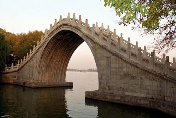 玉帶橋:玉帶橋位于北京頤和園昆明湖長堤上,建于清乾隆年間(公元1736-1795年)。該橋單孔凈跨11.38米,矢高約7.5米,全部用玉石琢成,橋面是雙反向曲線,組成波形線橋型,配有精制白石欄板,顯得格外富麗堂皇。此橋位于北京頤和園內(nèi),全橋用漢白玉石建成,拱圈為蛋形,兩側(cè)雕刻精美的欄板和望柱,通體潔白、線條流暢。遠望猶如一條玉帶點綴在碧波粼粼的昆明湖上,被游客贊為“海上仙島”