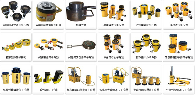 飛耀液壓千斤頂型號有幾十種,有本體高度很低的FY-RCS薄型、FY-RSM超薄型、FY-STC超低薄型、FY-UTC超高壓超低薄型。有用途廣泛的FY-RC單作用、FY-RR雙作用。有承載能力很大的FY-CLSG單作用大噸位、FY-CLRG雙作用大噸位。有活塞桿是中空的FY-RCH單作用中空型、FY-RRH雙作用中空型。有活塞桿帶螺紋的FY-CLP薄型螺母鎖定液壓千斤頂、FY-CLL機械式螺母鎖定千斤頂。以及鋁合金材質(zhì)的FY-RAC鋁制單作用千斤頂、FY-RAR鋁制雙作用千斤頂、FY-RACH鋁制中空千斤頂。另還有連體頂、機械頂、車載式頂?shù)鹊龋@里就不一一介紹。