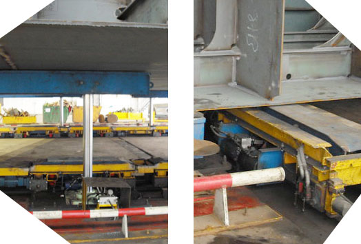 當各船體頂升到位后,將平板小車放置于船體之下,以便進行船體的移動。某些船體更要放置三維調(diào)整設(shè)備,以便對船體的三個維度都進行控制。